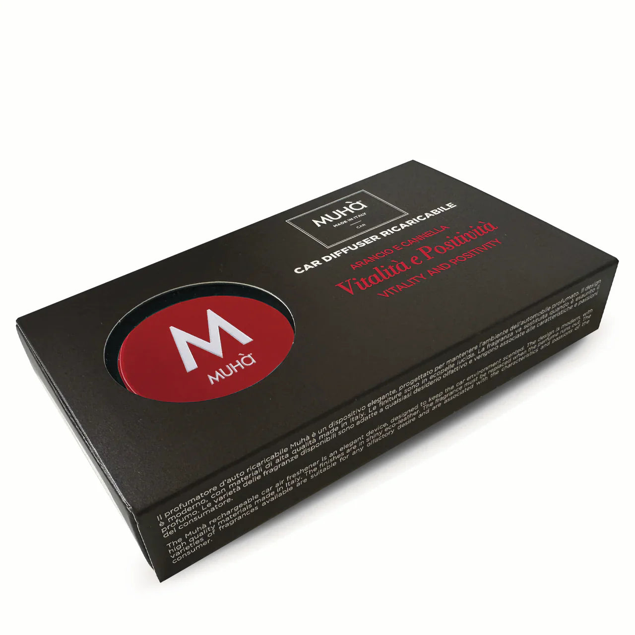Il profumatore d’auto ricaricabile Muhà è un dispositivo elegante, progettato per mantenere l’ambiente dell’automobile profumato. Il design è moderno, con materiali di alta qualità made in Italy.
